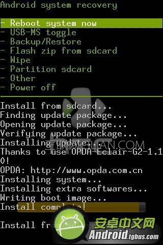 看到屏幕下方出現“Install from sdcard complete”的提示就說明刷機完成了。刷機完成後,界面回到Recovery模式,此時選擇一項Reboot system now重啟手機。