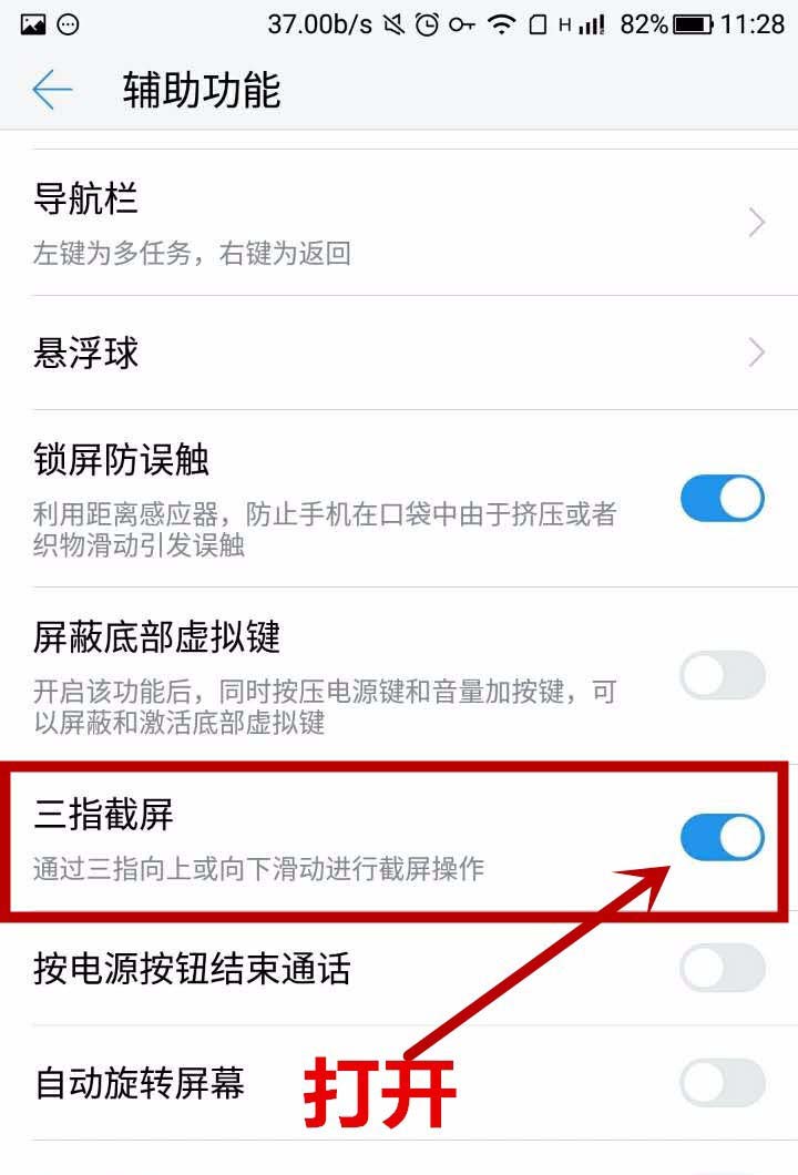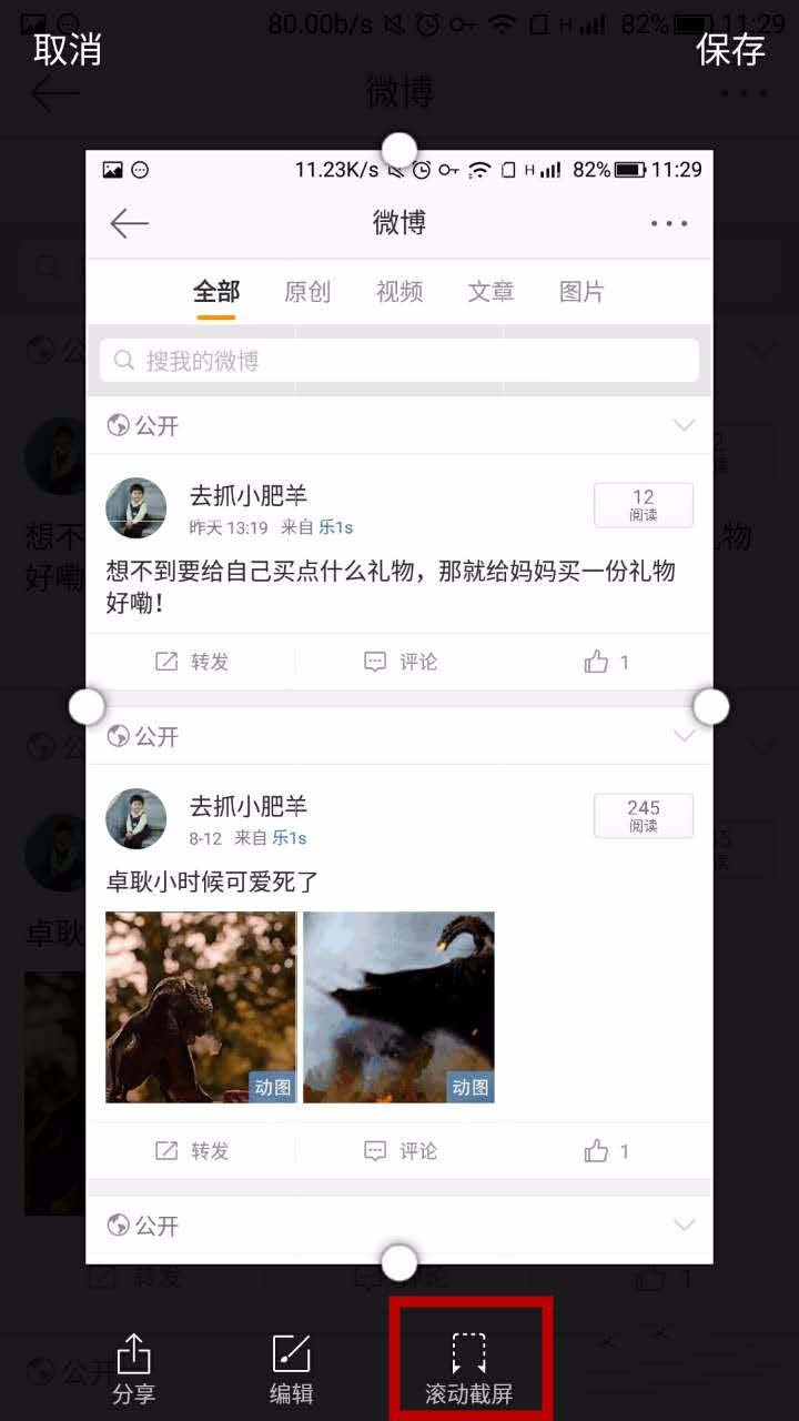 1、找到想要滾動截屏的界面,三指截屏後(也可以用音量減+電源鍵截屏),找到下方“滾動截屏”,用你的小手手輕輕點一下。