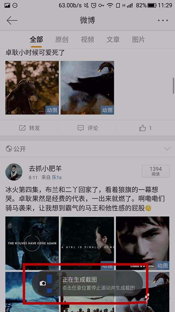 2、然後手機就進入滾動截屏啦,很神奇吧,想要停止截屏,就在任意位置點一下,然後保存圖片後就可以去曬圖裝逼啦。