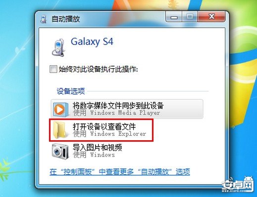2. 手機通過隨機的USB線與電腦進行連接,連接成功後,電腦會自動識別出“可移動磁盤”,在彈出的窗口中點擊【打開設備以查看文件】,若電腦不能自動彈出窗口,請手動雙擊便攜設備對應的盤符。(注:這裡以“Win7系統“電腦為例,如使用其他系統或版本名稱可能會有變化)