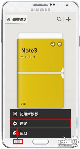 3、在S Note的主屏幕中,點擊左下角【菜單】鍵,並選擇【設定】;