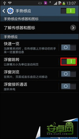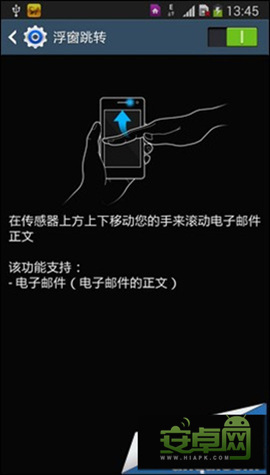 現在和大家分享一個三星Note3使用技巧——如何使用浮窗跳轉功能,Galaxy Note3的浮窗跳轉,又叫手勢滾動頁面功能,浏覽電子郵件內容時,不需要用手觸摸屏幕向上或者向下滾動,只需要在傳感器上方向上或向下移動你的手,即實現內容滾動。此功能如何開啟和使用,請看下面的具體操作方法: