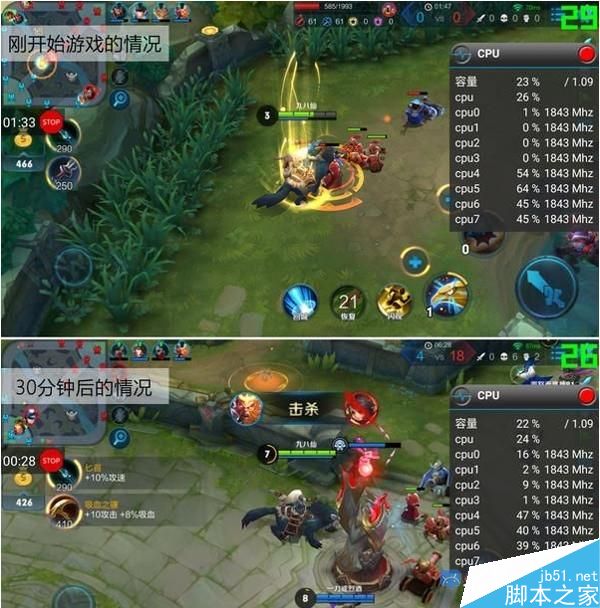 游戲剛開始時,骁龍625八個核心就像打了雞血一樣,八個核心的主頻都達到1.8GHz(但其中四個調用率不高),游戲畫面同樣保持30 FPS幀左右,比較流暢。值得一提的是,經過30分鐘的游戲時間,手機發熱量雖然增加,但處理器並沒有出現降頻的情況,八顆核心仍然保持在1.8GHz頻率的運行狀態,畫面依然十分流暢。