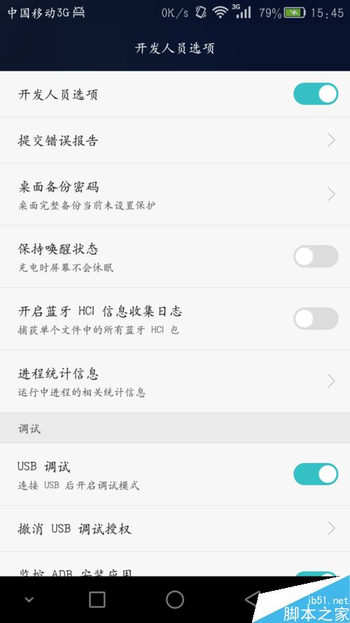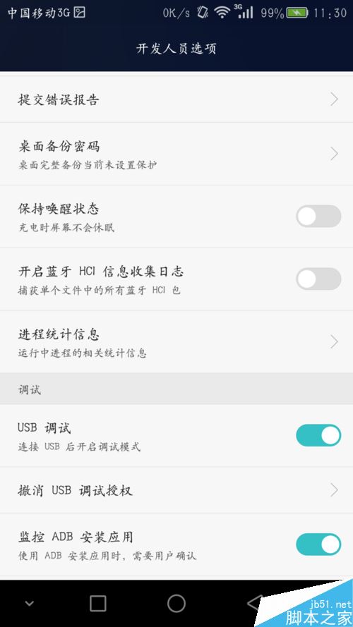 打開開發人員選項,然後我們就能找到USB調試開關了,這時,撥動其開關USB調試就可以打開了。