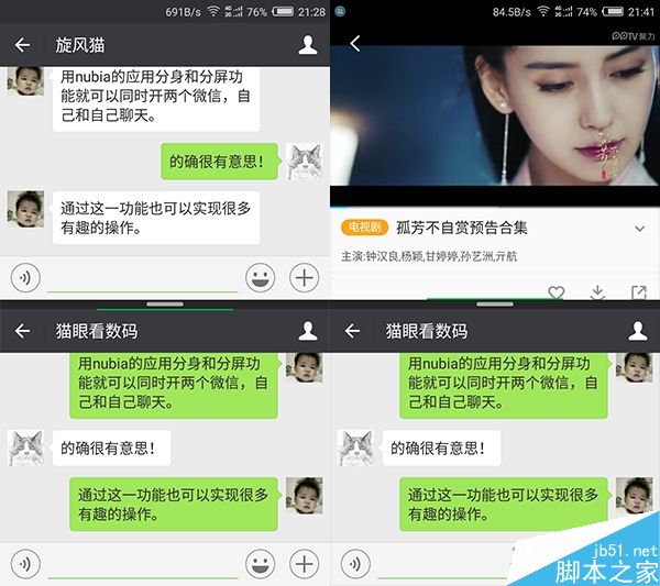 另外nubia UI 4.0還支持分屏功能,使用手指從屏幕下方向上滑動就可以啟動分屏,在分屏模式下可以同時開啟兩個微信界面,非常適合平時有多個微信號而且好友較多,經常需要聯絡的網友。