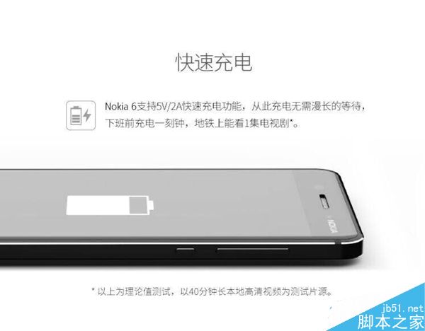 根據諾基亞官方的介紹,諾基亞6內置3000mAh的不可拆卸電池,配備5V/2A的電源適配器,並支持快速充電,充電15分鐘就可以堅持播放一集40分鐘的電視劇。