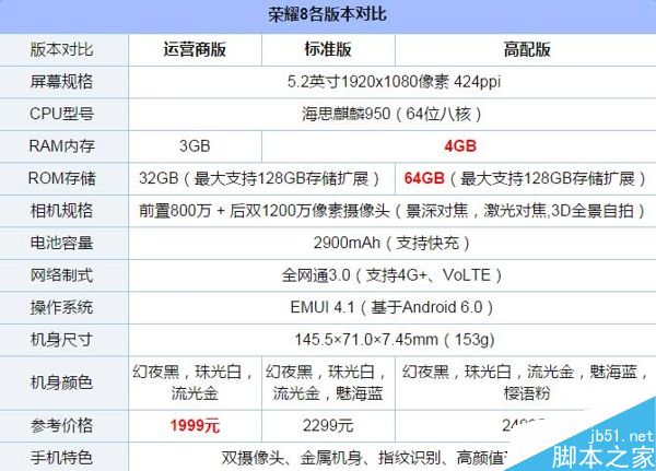 下圖為榮耀8各個版本之間的參數對比,通過下方表格可以看出三者的價格以及配置差別: