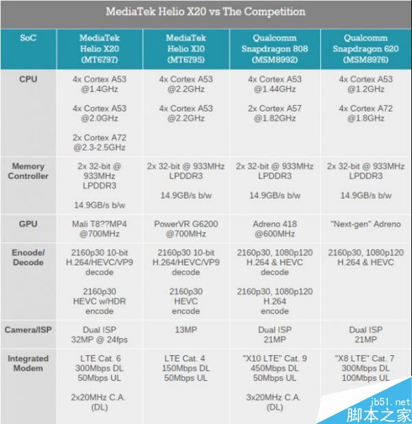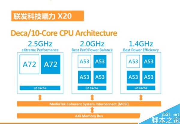 從聯發科公布的資料來看,Helio X20的十核心組成分為,兩顆2.5GHz主頻的Cortex-A72核心,四顆主頻2GHz的Cortex-A53核心以及四顆主頻1.4GHz的Cortex-A53核心,並通過聯發科自主的MCSI互聯總線進行連接。另外,在GPU方面采用的是主頻780MHz的Mali-T880 MP4,支持雙主攝像頭、最高支持3200萬像素攝像頭、2K顯示屏(刷新頻率提高至120Hz)、4K分辨率視頻的拍攝,同時增加3D深度和多重降噪。