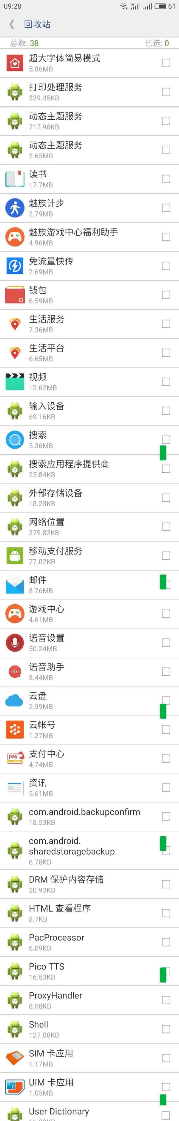 上圖為精簡後的截圖,大家可以看出,精簡過後的魅藍Note 5原版100多個軟件,精簡之後留下了和系統底層相關的軟件只有60多個。這樣大大提高了系統的運行效率,也大大提高了手機的流暢度。不過需要注意的一點是,以上的軟件均為系統運行必須的軟件,不要輕易刪除。不然會出現各種各樣的問題,導致最終手機使用出現問題,這樣的話就得不償失了。