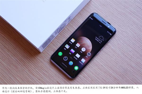 回到Magic產品本身,亮點也比較足,首先是八曲面造型(5.09寸2K屏),前後3D玻璃,四周都進行了打磨;其次是四顆攝像頭,前後都是雙攝,其中前置有一顆紅外感應,方便虹膜、眼球識別互動;第三點是Magic Live人工智能系統;最後就是市售最強的快充技術,充電器規格為5V/8A,號稱30分鐘可充滿90%。