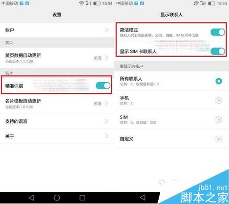 三、最後,點擊聯系人設置,選擇【精准識別】,簡潔模式,顯示SIM聯系人,可以最好的顯示手機聯系人,如圖所示: