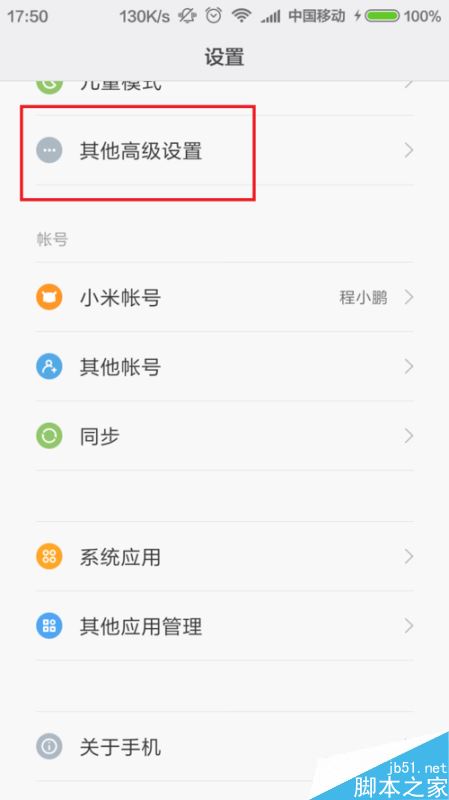 這裡推薦大家關閉USB調試功能,如果你只是使用USB數據線傳輸電腦與手機中的文件,那麼是不需要開啟USB調試功能的。以小米手機為例,打開MIUI中的設置-其他應用高級設置選項。