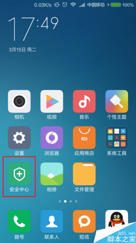 在最新的MIUI開發版系統中,提供了手機阻止USB安裝應用的功能,我們可以利用該功能來實現我們的目的。點擊手機UI中的“安全中心”圖標,進入安全中心設置頁面。