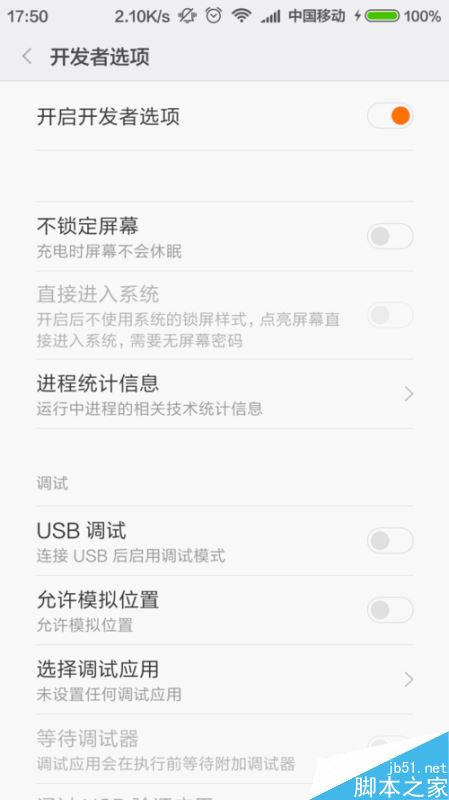 在開發者選項菜單頁面中,可以看到默認USB調試功能處於開啟狀態,點擊其中的切換按鈕將其關閉。