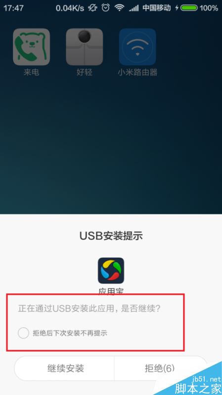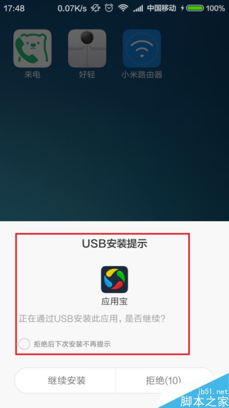 接下來,如果我們嘗試使用USB數據線連接手機與電腦時,當電腦嘗試自動安裝應用時,手機桌面底端會彈出對應的懸浮窗口,在該懸浮窗口中可以選擇允許或阻止。