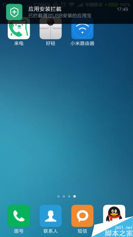 當你選擇阻止安裝該應用時,當軟件再次嘗試通過USB數據線連接手機安裝該應用時,手機系統頂端會彈出應用被阻止安裝的提示窗口。