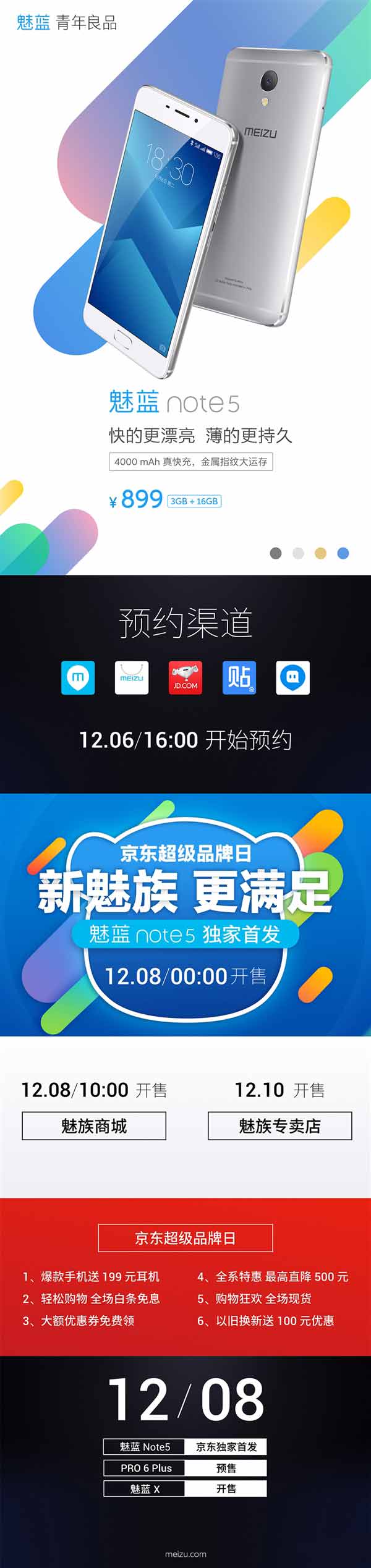 魅藍Note 5今天下午16:00魅族商城、京東商城、百度貼吧、陌陌開始預約,12月8日00:00 京東首發開日,當日10:00魅族商城開售。10日起,魅族專賣店及線下門店陸續開售。