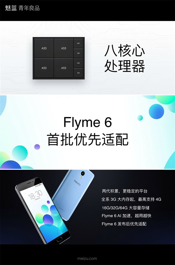 此外,新機依然支持mBack按鍵,提供0.2秒的技術指紋解鎖功能,前置攝像頭是500萬像素(0.2秒的PDAF相位對焦,虹軟算法),主攝像頭是1300萬像素,搭載聯發科P10八核處理器和3GB內存,同時還有4GB RAM內存版本可選,存儲空間是16/32/64GB,運行Flyme6系統,內置4000mAh容量電池(支持18W快充)。