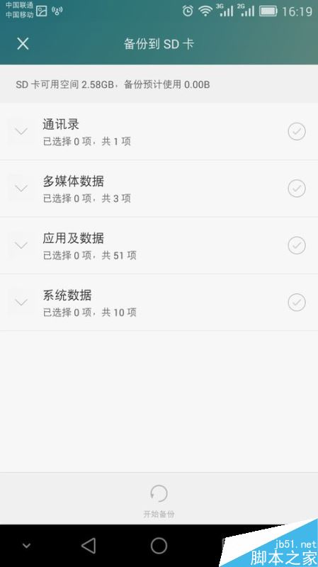 出現備份選項,這裡就看清是備份到內部儲存還是SD卡,我是SD卡。然後輕點系統數據,在下面選中WLAN及密碼。