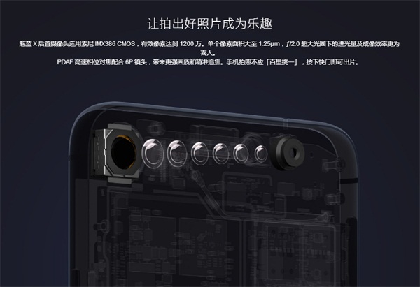 至於攝像頭方面,魅藍X擁有1200萬後置攝像頭,選用索尼IMX386 CMOS,搭配ƒ/2.0 超大光圈采光效率更高,成像更清晰。