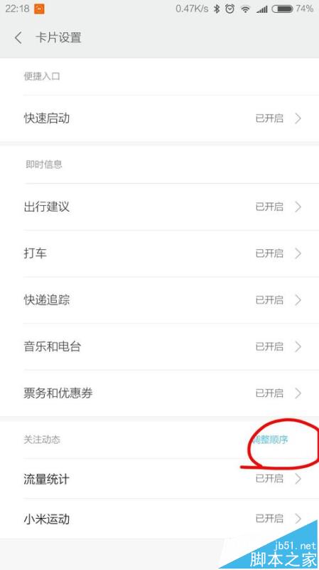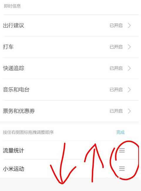 5、點擊紅圈中的圖標,可以設置負一屏幕的顯示信息順序。