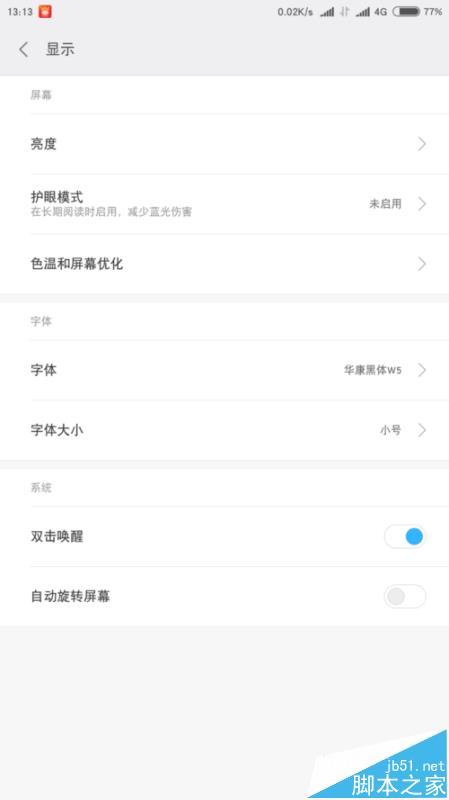 在設置中,我們可以看到有一個個人的分頁符,我們的大部分個性化就是在這裡實現。首先,我們看顯示裡面,這裡有亮度以及護眼模式、色溫和屏幕優化,字體、字體大小、雙擊喚醒以及自動旋轉屏幕。我們重點看看字體以及字體大小吧。