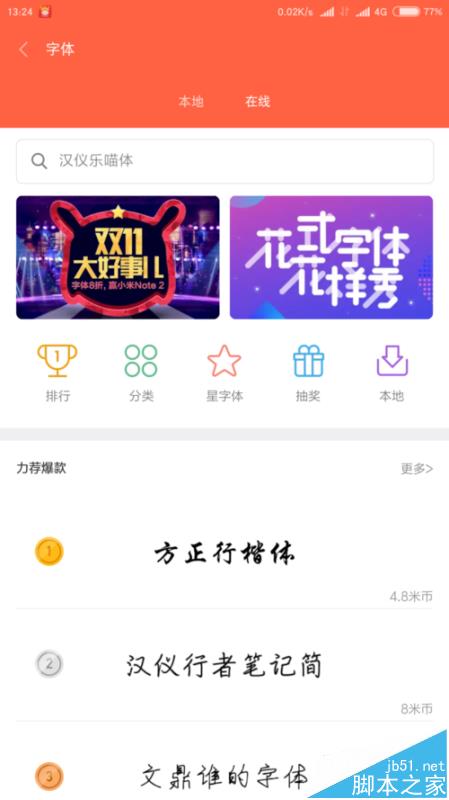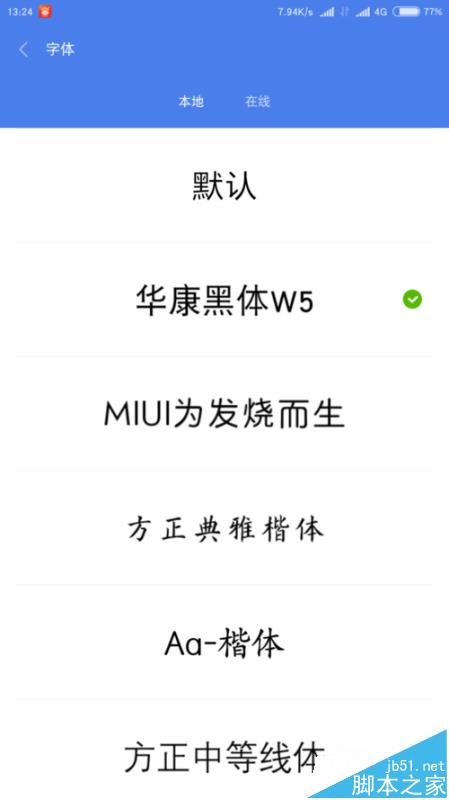 首先,看字體,點擊字體選項,會跳入主題商店的字體選項,在這裡我們可以選擇在線和本地兩個選項。我們可以自己選擇自己喜歡的字體進行下載。這也是很方便的啊,雖說現在大部分手機都支持,但是小米手機的字體數目是最多的。同時我們也可以去論壇下載MTZ格式的字體。但是需要小米賬號是小米設計師。小編就不介紹啦!
