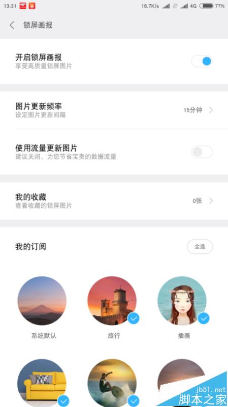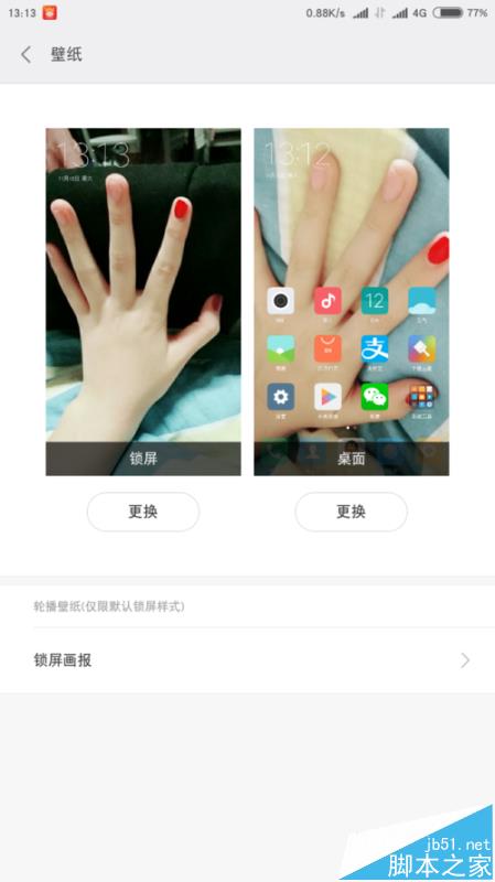 點擊進去,會有鎖屏和桌面兩個選項,可以自定義也可以去主題商店裡下載。重點是輪播壁紙,不過目前只支持鎖屏哦,在這裡面有許多的壁紙類別你可以選擇。