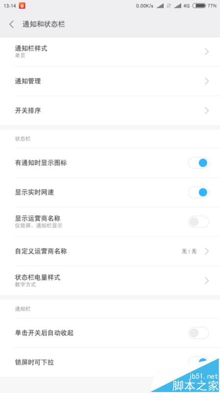 4、通知和狀態欄,在這裡,我們可以選擇通知欄的樣式,單頁還是雙頁。可以顯示實時網速。特別值得一說的就是可以自定義運營商的名稱。自己想叫啥就叫啥。