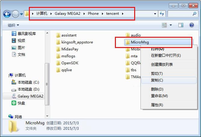 1,用數據線連接手機與電腦,在電腦中打開手機盤符下的Tencent文件夾並找到MicroMsg 文件夾,將此文件夾復制保存到當前電腦中,並重命名為“資源目錄MicroMsg”。