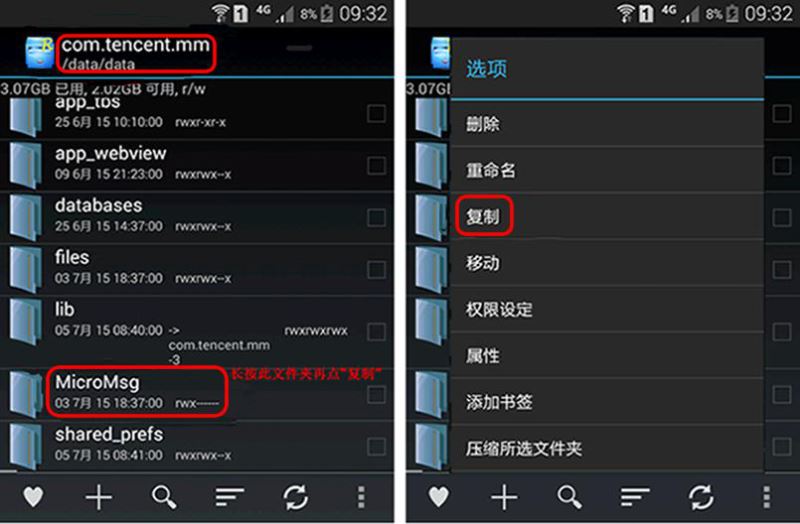 3.用360手機助手或騰訊助手下載安裝“RE管理器 rootexplorer”後打開此軟件,然後依次點擊進入data\data\com.tencent.mm\,就可以找到之前被隱藏的“MicroMsg”文件夾;長按此文件夾名字後,在彈出的選項窗口中選擇“復制”選項;