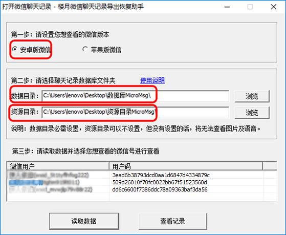 5.下載並安裝聊天記錄導出查看軟件將上面保存的微信聊天記錄導出到電腦上查看,方法如下:在百度上搜索“樓月微信聊天記錄導出恢復助手”,安裝後打開此軟件。選擇“安卓版微信”,設置數據目錄及資源目錄地址設置為導出到電腦中的兩個相對應的MicroMsg文件夾地址;然後點擊“讀取數據”,在數據讀取框中將顯示出所有在此手機上登錄過的微信賬號。所以用這種方法不論你有兩個或多個微信賬號,只要在此手機上登錄過的,都可以一一查看到。