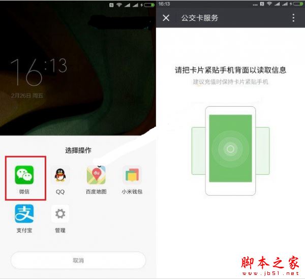 第二步:然後將公交卡貼在小米Note2手機背部,靠近NFC感應區域,之後手機會彈出一個選擇操作界面,這裡我們選擇「微信」以後,默認會進入微信的“公交卡服務”界面,如圖所示。
