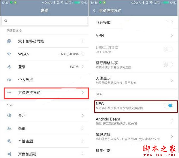 由於小米Note2默認NFC功能是關閉的,用戶需要進入手機「設置」->「更多連接方式」->「NFC」,然後開啟NFC功能,如圖所示。