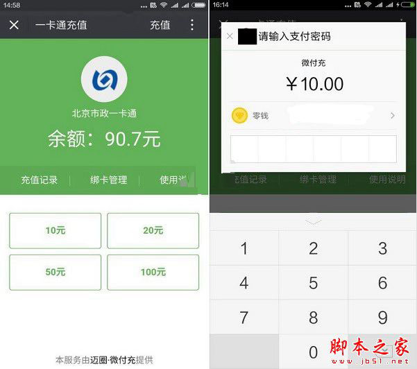 第三步:在微信公交卡服務界面頂部可以看到公交卡的余額,下方可以選擇需要充值的面額,點擊充值面額後,就會彈出微信支付界面,並輸入微信支付密碼完成支付即可即可成功為公交卡充值,如圖。