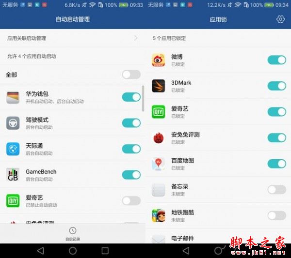另外,在管家中你還能發現自啟管理和應用鎖,自啟管理不用解釋大家在電腦上估計都用過,應用鎖功能可能有些用戶並不熟悉,它可以將App加個密碼,打開時需要輸入密碼才可以,同樣支持指紋解鎖,這樣就再也不怕微信消息、相冊被別人偷看了。