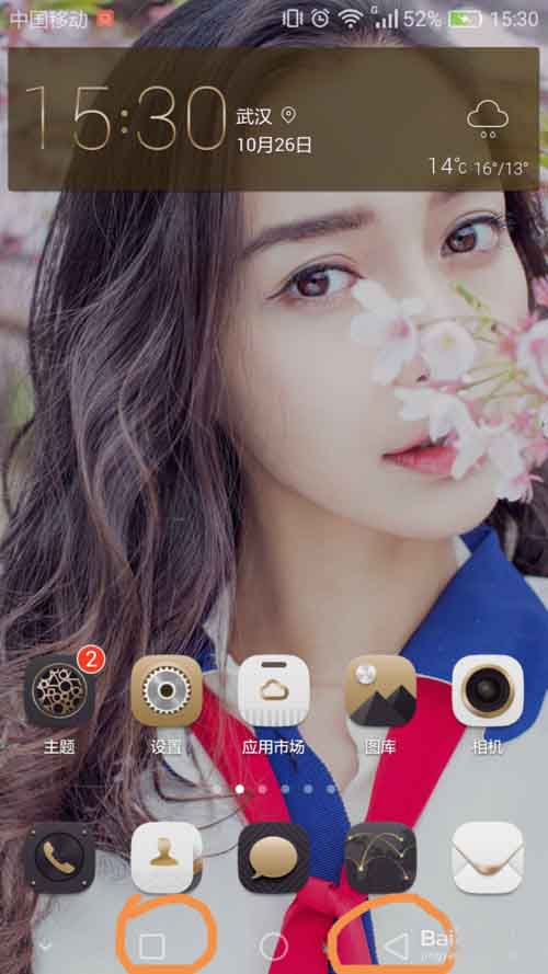 1、主屏幕顯示,把菜單鍵顯示出來,點出菜單欄將正方形功能鍵長按“口”。