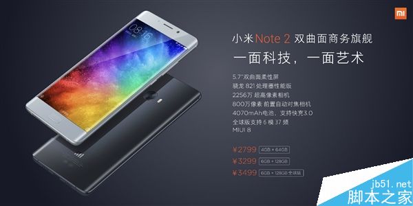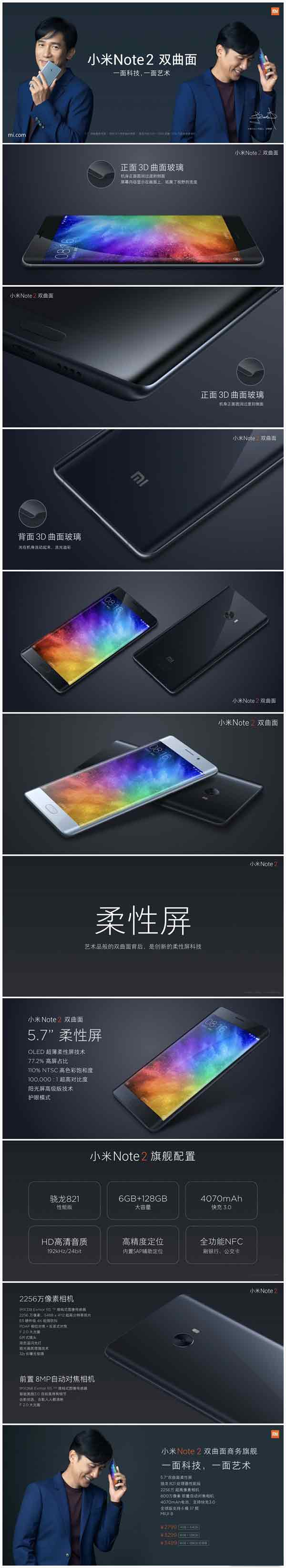 小米Note 2打著“一面科技 一面藝術”的口號,並請來影帝梁朝偉代言,采用5.7寸OLED雙曲面柔性屏,屏占比77.2%,110% NTSC高色域,100000:1對比度,背面則有3D曲面玻璃。