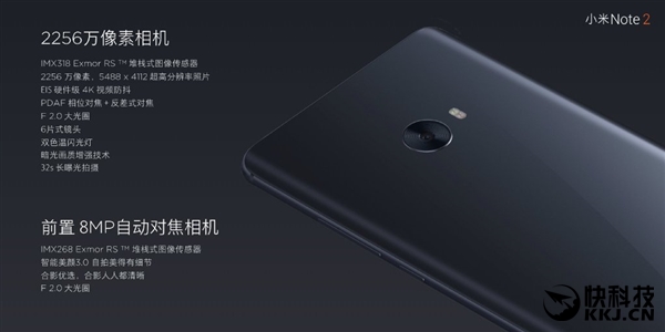 小米Note 2前置攝像頭則是IMX 268 800萬像素相機,具備F/2.0光圈,智能美顏3.0功能。支持自動對焦,自拍合影優選,人人都清晰。