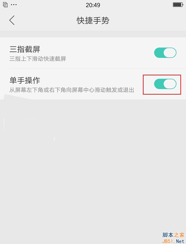 3、最後在快捷手勢頁面,找到並開啟【單手操作】按鈕開關即可,如下圖所示:
