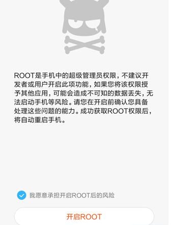 1、進入手機的“安全中心”,再選擇“ROOT權限管理”,接著勾選“我願意承擔開啟ROOT後的風險”,點擊開啟ROOT。