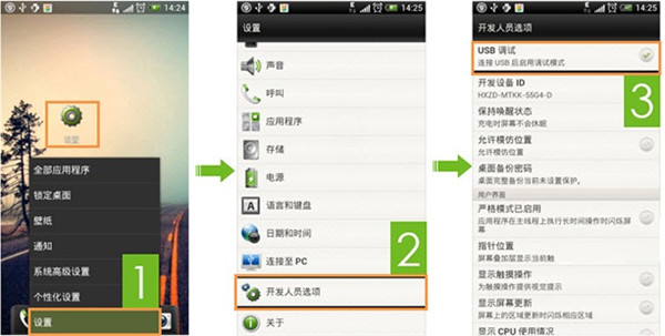 1.在手機中打開設置2.選擇開發人員選項3.勾選USB調試