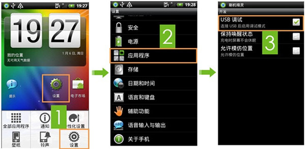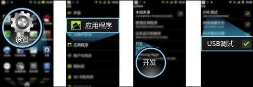 1.打開系統設置選項2.點擊應用程序3.點擊開發4.斷開數據線,然後勾選USB調試