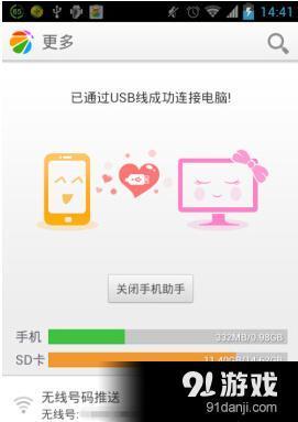 3、360手機助手的手機端安裝完後會自動打開,當看到"已通過USB線成功連接電腦"字樣時,手機連接360手機助手成功。