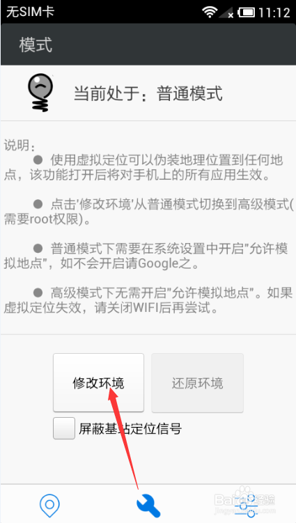 2.點擊底部中間的扳手圖標,進入「模式」頁面,點擊「修改環境」按鈕。修改成功後請按提示重啟手機,再打開神行者,就進入了高級模式。