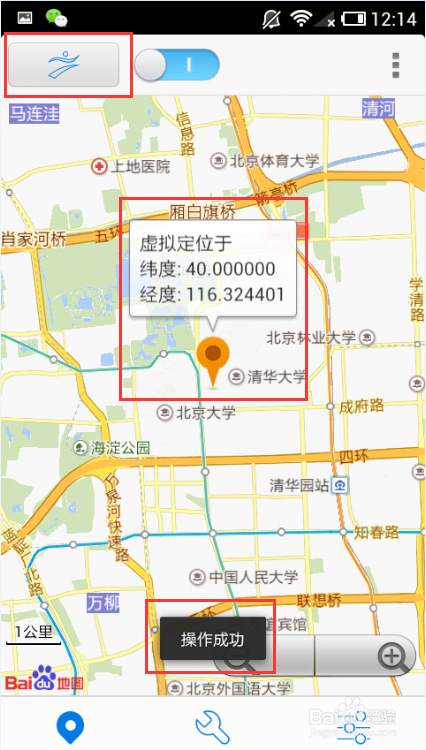 6.點擊左上角的神行者按鈕,圖標出現氣泡文字顯示經緯度,界面下方出現「操作成功」提示。恭喜你,你已經定位成功!