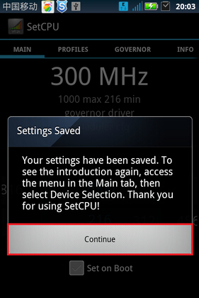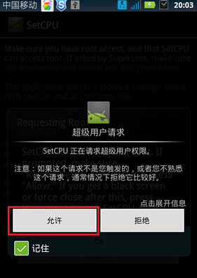 4、依次單擊"Continue Recommended,OK"之後,會彈出要求授予Root權限的對話框,選擇"允許"之後,單擊"Continue"(如果手機沒有Root,請參考相應文獻,將設備Root之後再使用Setcpu);