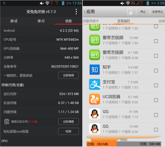 實驗機型配置:MT6582m@1.3GHz+1GB RAM,安卓4.2.2。實驗所用手機在2013年7月發布,筆者也使用了一年有多,最後因為機器實在太卡頓最後被放在抽屜裡鋪塵。