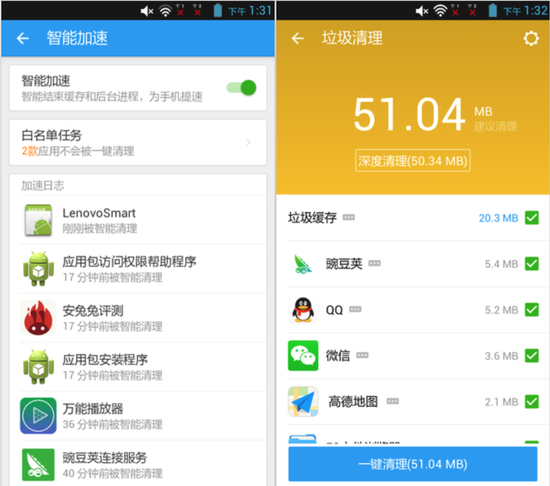 設置完自啟/程序喚醒之外,激活智能加速功能,LBE可以根據運行內存的占用狀況去自動清理後台進程,白名單同樣添加常用的軟件,例如微信、QQ等需要常駐後台的程序。而垃圾清理這個功能較為常見,筆者不過多闡述,只是垃圾清理可以忽略微信/QQ等,不然清理後進入這類軟件需要重新加載聯系人的頭像。