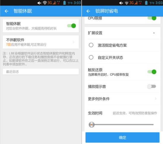 在節電優化中的“智能休眠”以及“鎖屏時省電”同樣推薦開啟,前者可以根據軟件的運行狀態自動休眠釋放內存,用戶同樣可以設置不進行休眠的軟件。而“鎖屏時省電”可以在用戶鎖屏時進行後台程序的清理(智能加速中白名單中的程序會保留),筆者建議激活“清理後台應用”、“CPU限頻”功能,激活“觸發還原”並且綜合自動鎖屏時間來設置上述功能的“生效時間”。